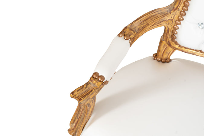 Sedia da bambino stile francese Luigi XVI, in legno massello di faggio, intagliata a mano. Finitura foglia oro anticato di dimensioni larghezza 51 cm, profondità 50 cm, altezza 73 cm. Seduta e schienale imbottiti artigianalmente in ecopelle.