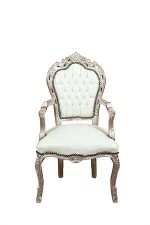 Poltrona stile francese Luigi XVI, in legno massello di faggio, intagliata e finita a mano con patina in foglia argento di dimensioni lunghezza 60 cm, profondità 60 cm, altezza 107 cm. Seduta e schienale imbottiti artigianalmente.