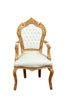 Poltrona stile francese Luigi XVI, in legno massello di faggio, intagliata e finita a mano con patina in foglia oro anticato di dimensioni lunghezza 60 cm, profondità 60 cm, altezza 107 cm. Seduta e schienale imbottiti artigianalmente.