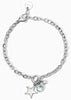 Bracciale in acciaio 316L con catena forzatina 4 mm, elemento centrale Ø 8 mm, ciondolo taglio stella 12x11.5 mm, perla conchiglia Ø 4 mm e cristalli azzurri Ø 6 mm, lunghezza regolabile da 16 a 19 cm