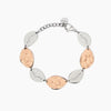 Bracciale in acciaio 316L con elementi martellati in PVD rosé 21.4x13.6 mm e lucidi 19x12 mm con cristalli Ø 1.5 e 1.25 mm, lunghezza regolabile da 16 a 19 cm, chiusura a moschettone.