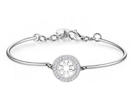 Bracciale da donna di Brosway della collezione chakra. Bracciale in acciaio con fiocco di neve. Chiusura a moschettone e diametro 70 mm.
