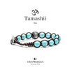 Bracciale unisex originale Tibetano Tamashii® della linea Ruota della Preghiera realizzato con pietre naturali di Turchese e cordoncino marrone.