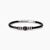 Bracciale regolabile da uomo in argento rodiato con lab leather nera intrecciata, elemento centrale con zirconi neri ed elementi in argento lucido e placcato oro rosa.