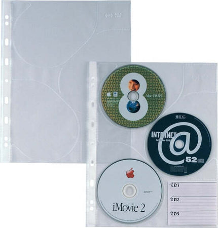 Busta con foratura universale rinforzata porta CD-DVD in PP liscio. Il particolare sistema di chiusura evita la fuoriuscita casuale dei CD. Adatte a contenere 3 CD-DVD. Dotate di etichette stampabili. Formato esterno 21x29.7cm. Formato contenuto 3 tasche