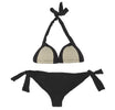Costume in due pezzi bicolore composto da reggiseno a triangolo imbottito e brasiliana abbellita da fiocchi che scendono elegantemente lungo i fianchi.