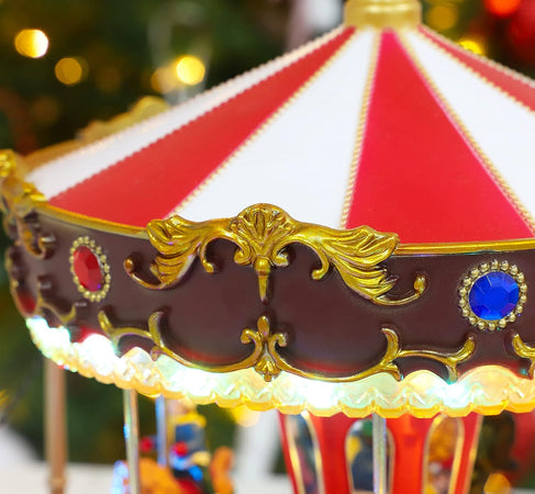 Questo carosello miniaturizzato è ispirato alle tradizionali giostrine che si trovano nei parchi divertimento durante le festività natalizie.