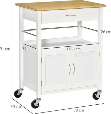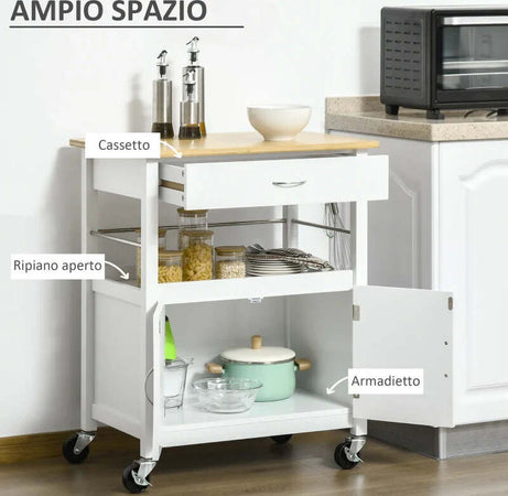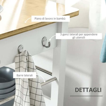 Carrello Cucina con Cassetto Armadietto e Scaffale, Carrellino Portavivande con Piano in Bambù e 4 Ruote, Bianco TY8801-215TY8