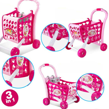 Carrello Spesa Supermarket per Bambina Colore Rosa con Frutta e Verdura 3in1 New