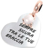 Charm della collezione Rerum Gioielli Famiglia-Perla da donna. Colore: argento, oro rosa e bianco. Il charm è in argento 925‰ a forma di cuore con scritta smaltata "Sempre sicura tra le tue braccia", impreziosito da perla naturale, composto da anellino di congiunzione e cuore logato entrambi placcati in oro rosa 18kt. Lunghezza: 20,70 mm. Ogni articolo è accompagnato da una “card gemma” che ne spiega le caratteristiche. Significato della perla: "E’ il tesoro per eccellenza. Viene custodita all’interno di una conchiglia, tenuta al riparo dagli elementi e preservata con cura. Rappresenta i valori più veri, la nostra FAMIGLIA, le nostre radici, il nostro mondo."
