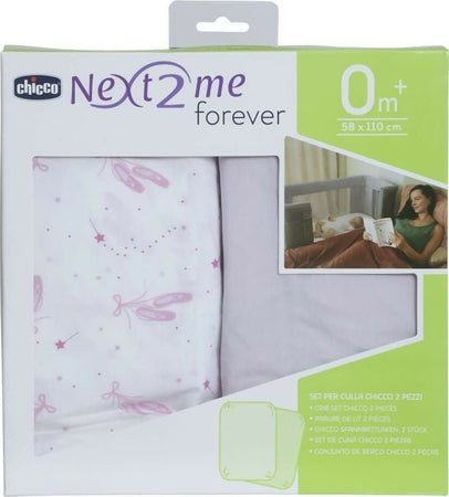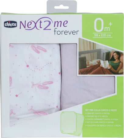 Chicco Set Lenzuola Culla 2 Pezzi Next2Me Forever Set Lenzuola Culla, Pink Ballet, Ballet, Lenzuoli con angoli 100% cotone, 58x110 cm