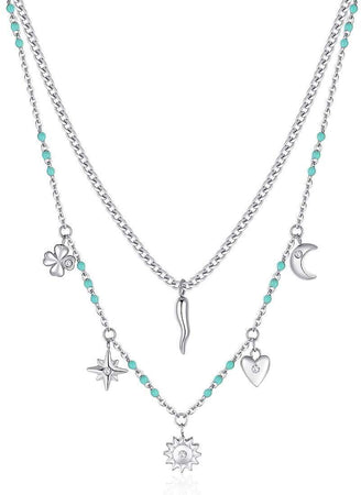 Collana A Due Fili Realizzata In Acciaio Con Pendenti Portafortuna Con Cristalli E Smalto Turchese.