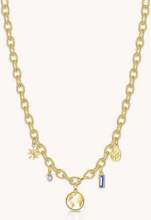 Collana da donna Brosway, catena rolò ovale in acciaio 316L, finitura color oro con pendenti a forma di mondo, stella e rosa dei venti, cristalli crystal e light sapphire.