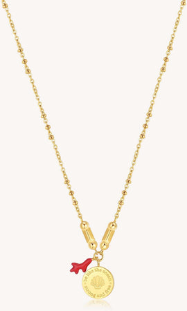 Collana girocollo in acciaio 316L e finitura pvd oro 14K con pendente a forma di corallo in smalto rosso, conchiglia con incisione e cristalli