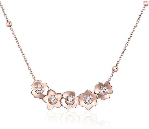 Collana In Acciaio Pvd Oro Rosa Con Cinque Fiori E Cristalli Swarovski Bianchi.