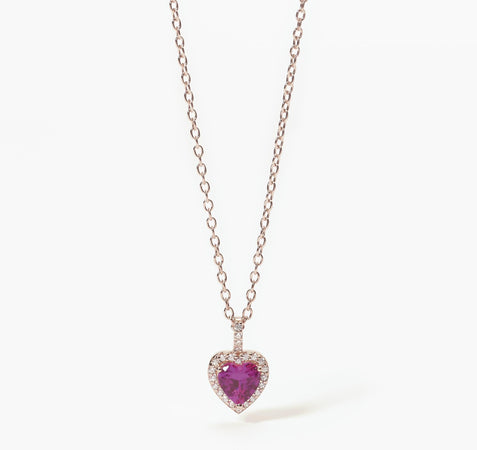 Collana in argento rosato con tormalina sintetica centrale a forma di cuore e zirconi.
