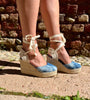 Semplicemente raffinato, il sandalo zeppa con laccio alla caviglia e lavorazione in tessuto. Molto più versatile di quel che si possa immaginare, questo modello sposa bene sia i look più minimal che quelli overdressed. La zeppa dai toni naturali ha quel tocco tutto italiano che fa di questo modello un accessorio decisamente must have.