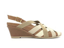 Sandali donna Comodaidea con tomaia in pelle e fascette elestiche colore beige e cuoio; fodera interna in pelle; sottopiede in pelle removibile per conferire in caso di necessità maggiore ampiùza alla calzatura; comoda zeppa; made in Italy.