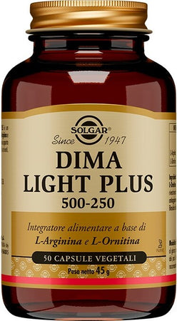 DIMA LIGHT PLUS integratore alimentare 50 capsule vegetali Solgar. Nelle proteine dei mammiferi tutti gli amminoacidi si trovano nella forma chimica Levogira (L), per cui negli integratori alimentari di qualità viene rispettata tale regola. DIMA LIGHT PLUS è un integratore alimentare contenente gli aminoacidi L-Arginina e L-Ornitina in forma libera. L-Arginina e L-Ornitina partecipano al ciclo dell'urea, un ciclo metabolico che permette di rimuovere l'ammoniaca in eccesso e che favorisce quindi l'eliminazione delle scorie azotate. L-Arginina partecipa alla sintesi endogena di Creatina, una fonte di energia cellulare, ed è coinvolta nella produzione di ossido nitrico, un vasodilatatore endogeno.