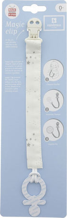 La catenella Magic Clip di Cambrass è specialmente indicata per fissare il ciuccio al vestitino del neonato, facendo sì che non cada per terra e si sporchInterlock Il sistema di regolazione del clip, oltre ad offrire la massima qualità sul mercato, garantisce un ottimo fissaggio anche quando il neonato si stiracchia con forza. L'innovatrice etichetta inclusa (obbligatoria per legge) si stacca dalla catenella tirandola leggermente, evitando così possibili graffi sul collo del neonato.