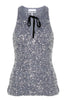 Modello in misto poliestere riciclato, design con paillettes, scollo con spacco, chiusura frontale con fiocco,senza maniche, orlo dritto, design aderente. Composizione poliestere riciclato 95%, elastam 5%