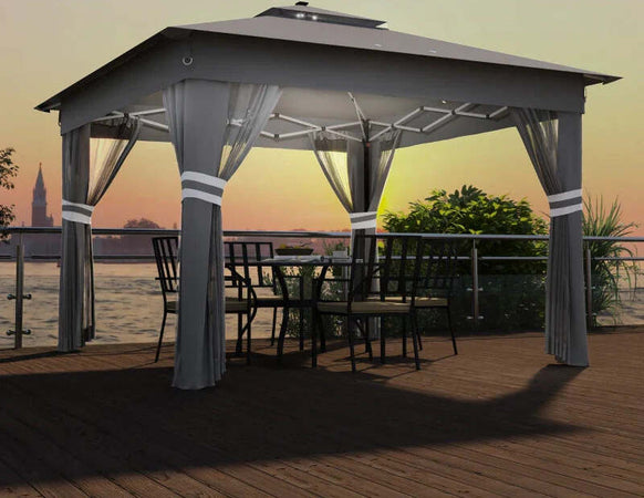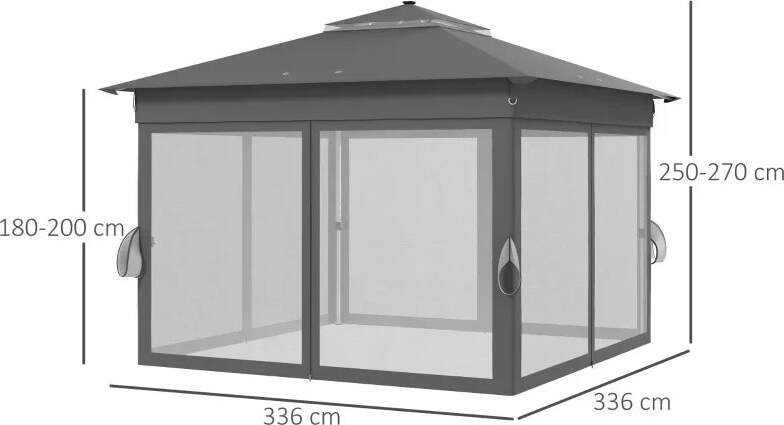 Gazebo da Giardino ad Altezza Regolabile con Luci LED, in Acciaio e tessuto Oxford, 336x336x250-270 cm, Grigio 84C-483V00WT