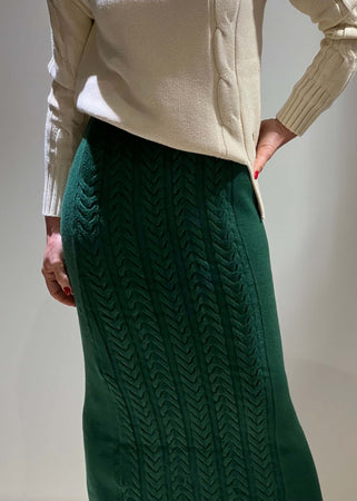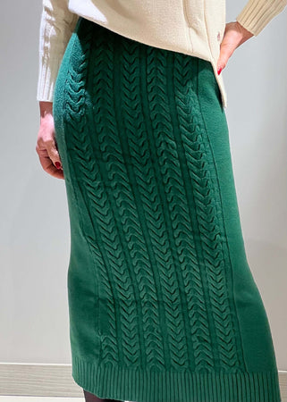 Gonna lunga verde in maglia che sfiora la caviglia, caratterizzata da un pratico elastico in vita.