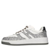 Sneakers in pelle e strass. Chiusura frontale con lacci. Tomaia interna in pelle e tessuto. Suola esterna in gomma.