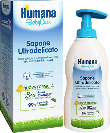 Humana Babycare Sapone Ultradelicato  300 Ml 99% Di Ingredienti Naturali Humana Bio Idramilk. SAPONE ULTRADELICATO HUMANA BABYCARE: I prodotti della linea bagnetto Humana BabyCare (Bagnoschiuma Ultradelicato, Shampoo Antilacrime, Detergente Corpo-Capelli e Sapone Liquido Ultradelicato) sono stati formulati con tensioattivi ultradelicati (derivati dall’olio di cocco, di oliva, di palma e di girasole) per renderli meno aggressivi, più emollienti ed idratanti, nel rispetto della cute delicata del bambino.