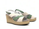 Sandalo con zeppa color salvia e avorio zeppa in finta corda costruzione antishock in corrispondenza del tallone forme anatomiche calibrate per il massimo rispetto dell'anatomia delpiede.