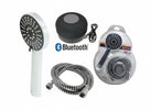 Corpo cromato in ABS. Kit composto da doccia 3 posizioni, flessibile cromo. Speaker nero bluetooth in ABS con cavetto USB per ricarica.