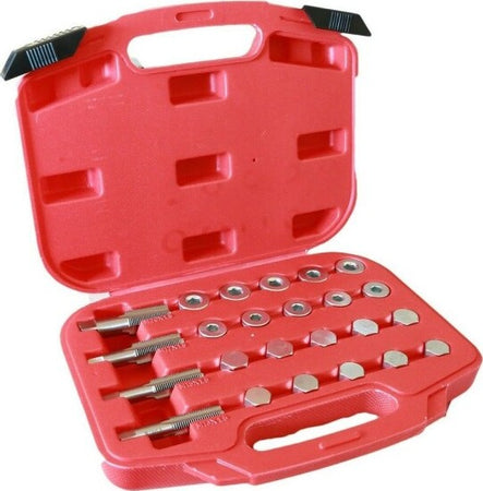 Kit riparazione filettatura della coppa olio composto da maschi per filettare, tappi di scarico e rondelle in alluminio. Grazie a questo kit è possibile sostituire il tappo usurato e ove occorre rifare la filettatura danneggiata della coppa della maggior parte di modelli di automobili e veicoli commerciali leggeri delle seguenti marche: Audi, VW, BMW, Citroen, Fiat, Ford, Seat, Honda, Mazda, Mitsubishi, Opel, Peugeot, Renault, Toyota e Volvo. Il kit comprende: Questo superbo kit di riparazione tappi di scarico dell'olio composto da 4 rubinetti, 20 tappi di scarico olio e 40 rondelle in alluminio forniti in una custodia valigetta, è ideale per la riparazione di fili di coppa, cambio e differenziale.