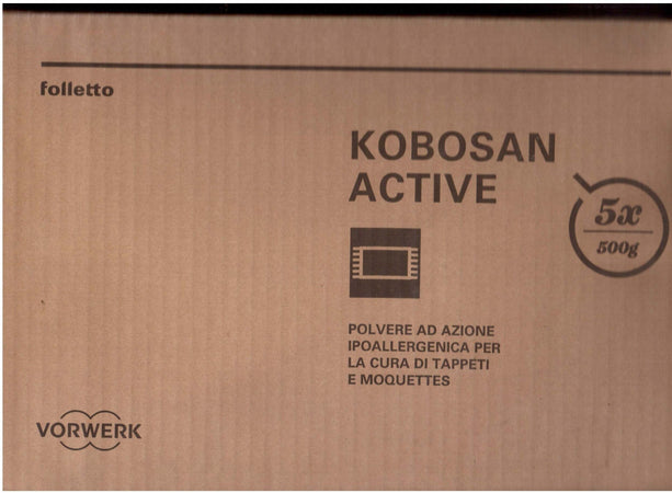Venduto in confezione da 5 buste da 500 g cadauna, il Kobosan Active possiede la proprietà di igienizzare e ridare lucentezza ai tappetti; inoltre un miglior risultato è ottenibile usando il Kobosan con il battitappeto Folletto.