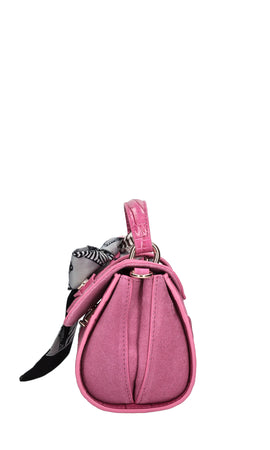 Borsa mini Tempest in camoscio e pelle. Un comparto. Chiusura con bottone a scatto. Tracolla golden chain in pelle removibile. Fiocco decorativo removibile.