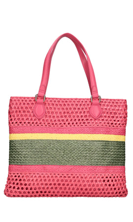 Borsa Glory in rafia ed ecopelle. Un comparto. Chiusura con bottone magnetico. Manici in ecopelle.