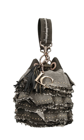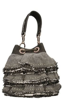 Borsa Nimes in denim. Dettagli in metallo dorato ed ecopelle. Un comparto. Chiusura con bottone magnetico e coulisse. Manico denim e tracolla golden chain ed ecopelle removibili.