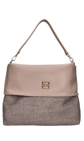 Borsa CARPET in ecopelle e rafia. Un comparto. Parte superiore reversibile e dettagli color oro. Tracolla golden chain in ecopelle removibile.