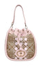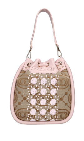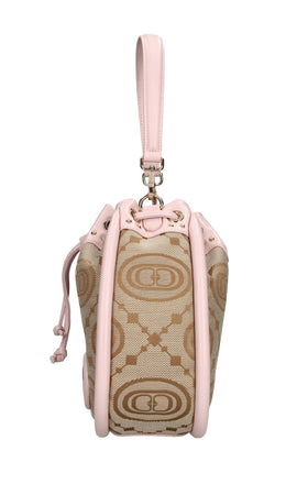 Borsa monogram in pelle e tessuto. 1 Comparto. Chiusura a culisse. Tracolla golden chain e pelle rimovibile. Spedito su busta trasparente.