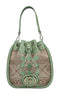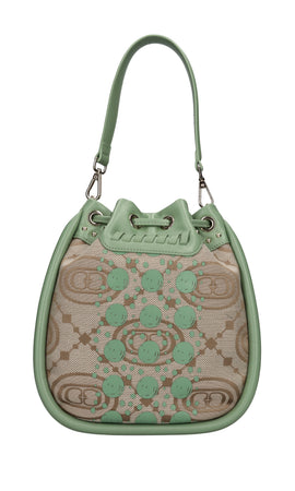 Borsa monogram in pelle e tessuto. 1 Comparto. Chiusura a culisse. Tracolla golden chain e pelle rimovibile. Spedito su busta trasparente.