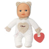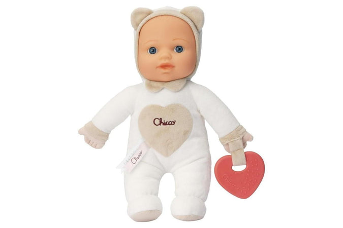 Dolce bambola da coccolare con tessuto morbido, viso sorridente in plastica morbida, Tutina bianca con decorazioni crema e accessorio dentizione rosa. Aiuta lo sviluppo sensoriale del bambino, nello specifico: affettivita', immaginazione e fantasia