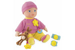 Dolce bambola da coccolare con tessuto morbido, viso sorridente in plastica morbida, vestitini e accessori colorati. Include un massaggiagengive e un piccolo amico coniglietto che puo' essere attaccato ai braccialetti per la bambola o il bambino. Aiuta lo sviluppo sensoriale del bambino, nello specifico: affettivita', immaginazione e fantasia