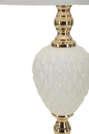 Lampada in ceramica bianca con rifiniture dorate dal design semplice ed elegante. Completa di paralume in tessuto bianco.