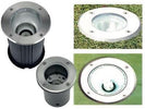 Disco di copertura in acciaio inox, corpo interno in alluminio, esterno in plastica. schermo in vetro infrangibile calpestabile (max 500 Kg).  Max 50 Watt