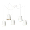 Lampadario 5 Luci Link In Acciaio Cavo Lungo E Paralumi Cono Bianco E Oro