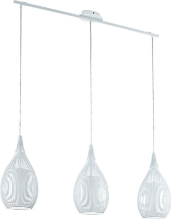 La lampada a sospensione RAZONI ha tre paralumi bianchi in reticolato dalla forma a goccia ciascuno dei quali corredato di un cilindro interno in vetro bianco.