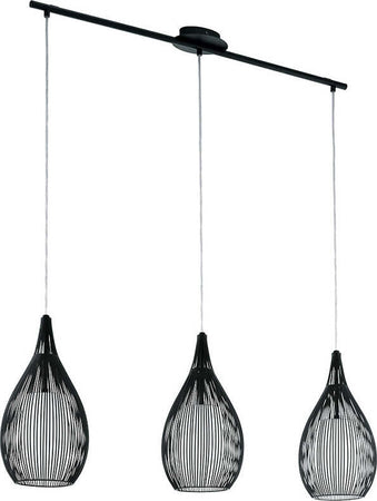 La lampada a sospensione RAZONI ha tre paralumi neri in reticolato dalla forma a goccia ciascuno dei quali corredato di un cilindro interno in vetro bianco.. A lampada accesa, i paralumi creano un intrigante gioco di luci e ombre. Questa lampada a sospensione dal design lineare e filante si armonizza perfettamente con stili di arredamento moderno e scandinavo e offre un'illuminazione accogliente nel soggiorno così come nella sala da pranzo. Le lampadine, previste con attacco E27, non sono incluse.