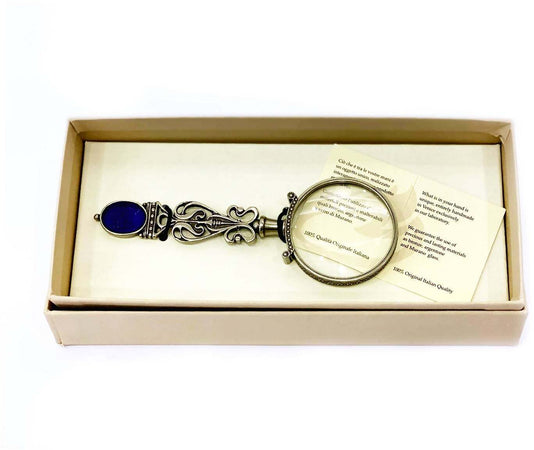 Lente d’ingrandimento lavorata a mano con l’utilizzo di metalli preziosi quali bronzo, argentone e vetro di Murano di Colore Blu. 100% origine Italiana.
