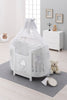 Misure cmm.69x133x110h. La confezione contiene il materasso ovale comfort cm 62x126, il completo sfilabile maxi e il set di fiocchi decorativi in tessuto.