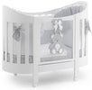 Misure cmm.69x133x110h. La confezione contiene il materasso ovale comfort cm 62x126, il completo sfilabile maxi e il set di fiocchi decorativi in tessuto.