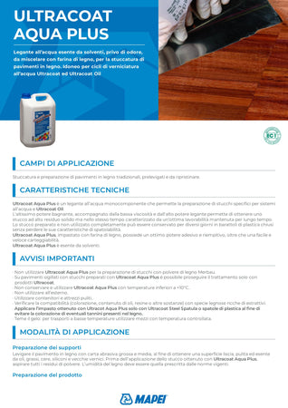 Ultracoat Aqua Plus ha una viscosità Brookfield di 2000-3000 mPa·s e una massa volumica di 1,0 g/cm³. Il consumo medio è di 100-120 g/m² per mano. Viene fornito in taniche da 5 L o box da 2x5 L. Conservabile per 12 mesi in ambienti asciutti.